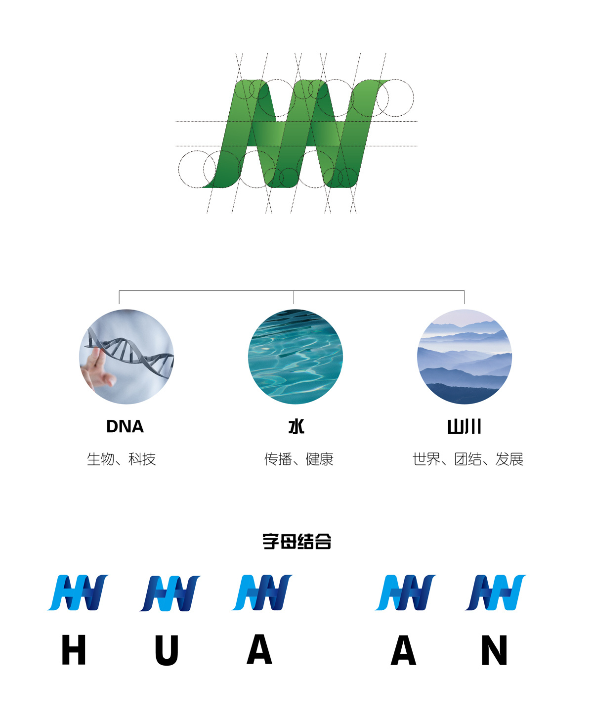 Logo通體采用綠色,代表健康環(huán)保,設計采用DNA、水波、山川進行結合